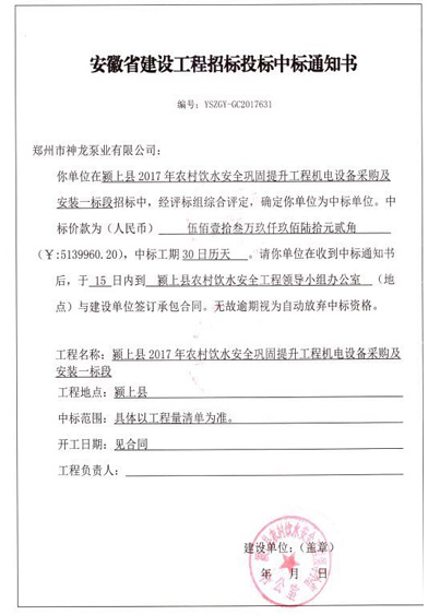 祝賀我司在安徽省農(nóng)村飲水工程中標(biāo)513萬余元